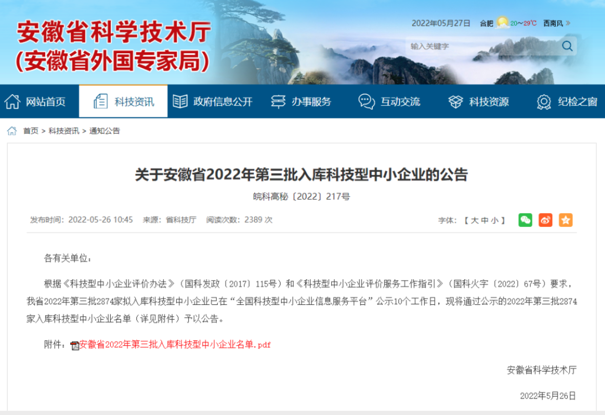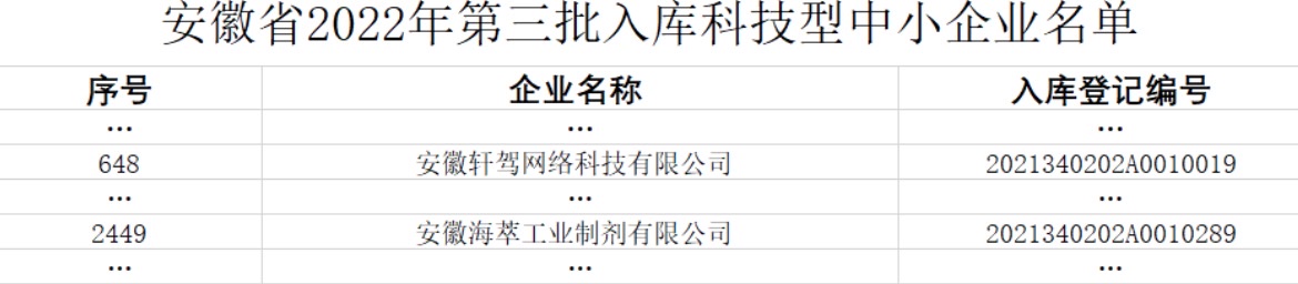 5月26日,安徽省科技廳公示了2022年第三批擬入庫科技型中小企業名單,園區安徽海萃工業制劑有限公司和安徽軒架網絡科技有限公司兩戶企業成功入庫。